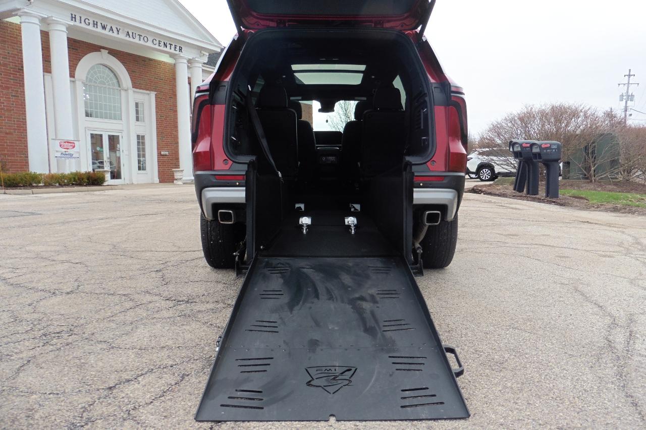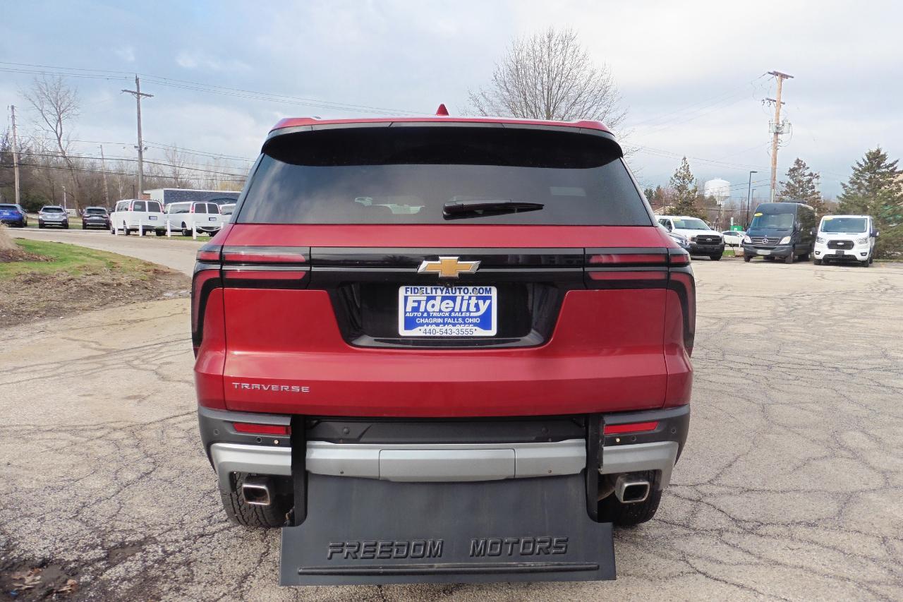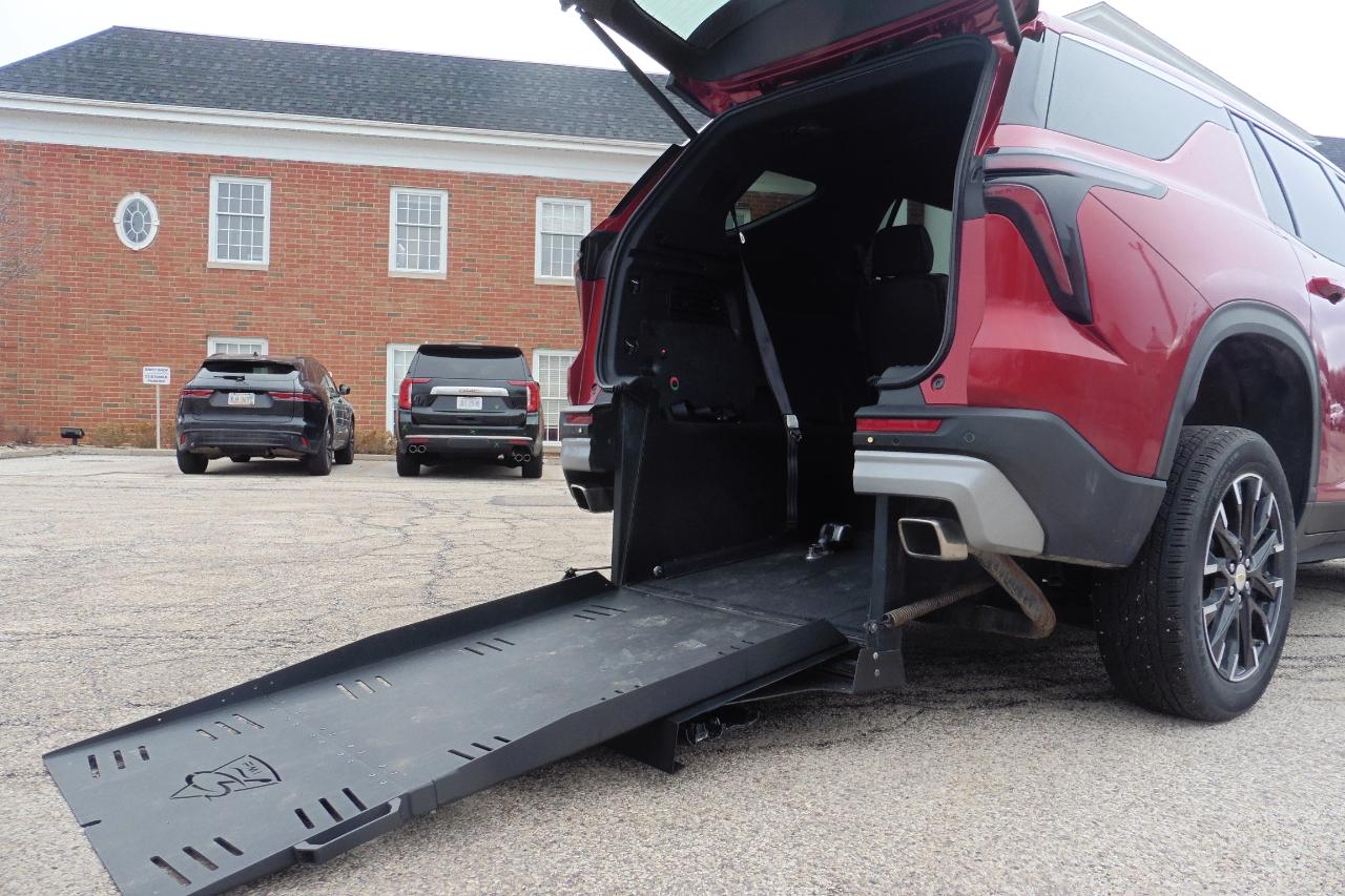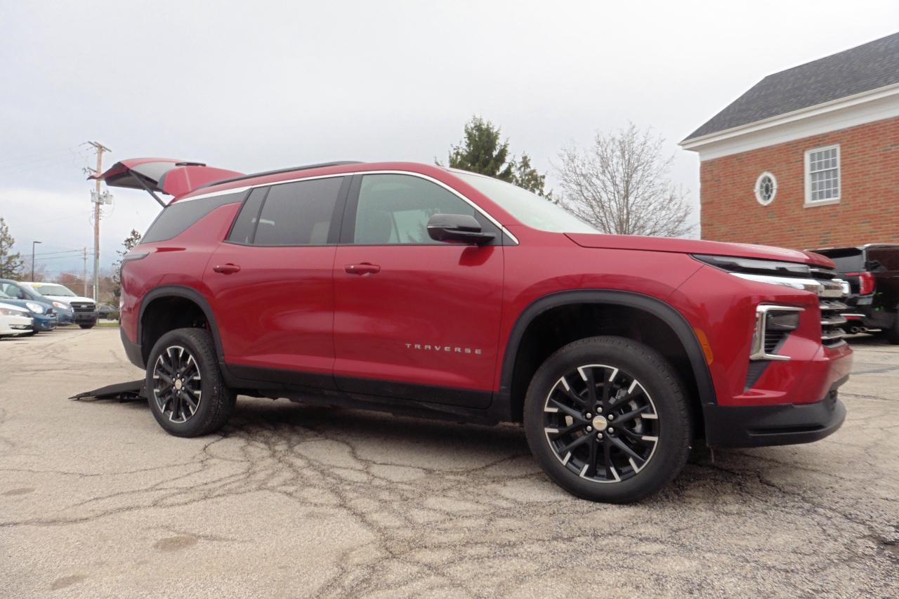 2025 Chevrolet Traverse LT FWD With A Freedom Motors Rear Entry AUTOMATIC ONE TOUCH Folding Wheelchair Access Ramp! ONLY 2080 MILES! Leather heated seats, Q-Straint tie downs, 2 leather rear foldable jump seats, PANORAMIC POWER SUNROOF, push button open/close rear power liftgate, heated steering wheel, back up camera, cruise control, Google Maps, Apple and Android Play, tinted rear windows, power windows, power locks, power mirrors, power drivers seat, Turbo 4 cylinder, automatic transmission, keyless entry with push button start, alloy wheels, premium sound system, and much more!